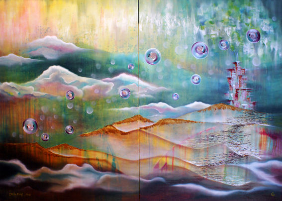 painting. diptik mixed media, acrylic, oil and collage on canvas.